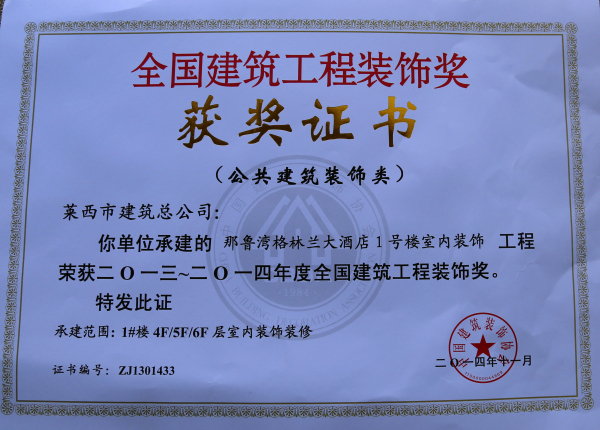 我公司施工的那魯灣格蘭大酒店1#樓室內(nèi)裝飾工程榮獲全國建筑工程裝飾獎