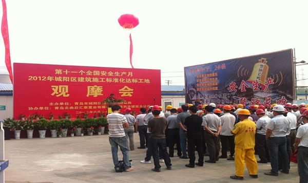 6月15日、20日,“城陽區(qū)質(zhì)量標(biāo)準(zhǔn)化管理現(xiàn)場觀摩會”、 “全區(qū)建筑施工標(biāo)準(zhǔn)化達標(biāo)工地現(xiàn)場觀摩會” 暨第十一個全國安全生產(chǎn)月啟動儀式,在我公司邴其利項目部施工的青特城工程召開。城陽區(qū)城市規(guī)劃建設(shè)局局長劉寧、副局長焦孟、區(qū)建管處主任李良本、質(zhì)監(jiān)站站長張衛(wèi)民等領(lǐng)導(dǎo)到會觀摩,全區(qū)相關(guān)單位780余人參加了會議。總公司副總經(jīng)理于振方陪同領(lǐng)導(dǎo)觀摩了施工現(xiàn)場,與會領(lǐng)導(dǎo)對現(xiàn)場工程質(zhì)量、安全生產(chǎn)標(biāo)準(zhǔn)化管理給予了高度評價。