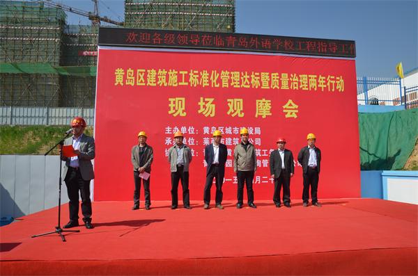 2015年4月22日上午,黃島區(qū)建筑施工標(biāo)準(zhǔn)化管理達(dá)標(biāo)暨質(zhì)量治理兩年行動(dòng)現(xiàn)場(chǎng)觀摩會(huì)在我公司孫有建項(xiàng)目部、顏坤項(xiàng)目部所施工的青島外語學(xué)校工程召開。青島市建管局總工程師孫憲閣,黃島區(qū)建管辦主任張偉,區(qū)質(zhì)監(jiān)站副站長李占勇,區(qū)建筑工務(wù)局副局長王城明,青島高園建設(shè)咨詢管理有限公司總經(jīng)理戚林立,我公司總經(jīng)理趙成福出席了本次觀摩會(huì)。