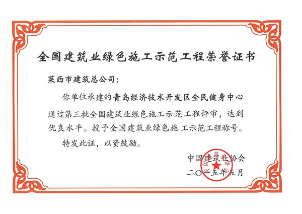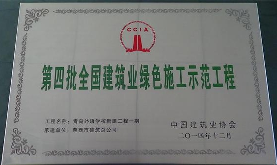 2015年5月13日,全國建筑業(yè)綠色施工經(jīng)驗交流會暨2014年度全國建設單位及工程項目節(jié)能減排達標競賽活動表彰大會、第四批全國建筑業(yè)綠色施工示范工程授牌大會在北京召開。我公司施工的全民健身中心工程通過全國第三批全國建筑業(yè)綠色施工示范工程評審,被授予“全國建筑業(yè)綠色施工示范工程”稱號;青島外語學校新建工程一期、德國企業(yè)中心項目、青島萬科廣場工程、凱豐國際廣場—城市微客廳、漢峪金融商務中心A7地塊一標段等五項工程榮獲第四批“全國建筑業(yè)綠色施工示范工程”。