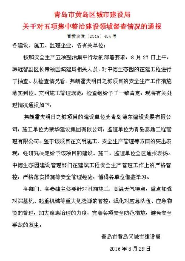 黃島區(qū)韓冠智副區(qū)長帶領(lǐng)區(qū)城建局相關(guān)人員,對(duì)中德生態(tài)園的在建工程進(jìn)行了安全生產(chǎn)五項(xiàng)整治集中行動(dòng)抽查。我集團(tuán)公司施工的弗朗霍夫明日之城項(xiàng)目在迎檢過程中,安全生產(chǎn)工作措施落實(shí)到位、文明施工管理規(guī)范,檢查組給予了一致好評(píng),受到了黃島區(qū)城建局的通報(bào)表揚(yáng),為集團(tuán)公司贏得了榮譽(yù)。