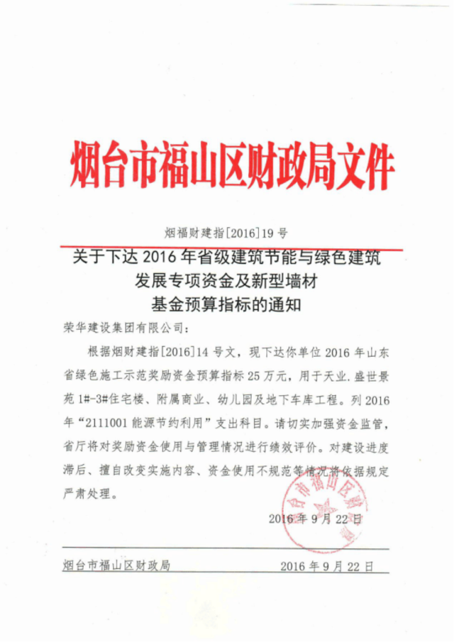 煙臺(tái)天業(yè)盛世景苑工程開(kāi)工伊始,充分利用現(xiàn)場(chǎng)自有條件,合理布局,嚴(yán)格執(zhí)行集團(tuán)綠色施工精細(xì)化管理標(biāo)準(zhǔn),多次受到煙臺(tái)市主管部門(mén)的肯定與表?yè)P(yáng)。該工程于2016年8月19日順利通過(guò)山東省住房和城鄉(xiāng)建設(shè)廳組織的“山東省綠色施工示范工程”專家組驗(yàn)收,專家組領(lǐng)導(dǎo)對(duì)現(xiàn)場(chǎng)綠色施工“四節(jié)一環(huán)?!钡某浞掷媒o予高度評(píng)價(jià)與認(rèn)可,為煙臺(tái)市綠色施工起到了示范帶領(lǐng)作用,煙臺(tái)市政府專門(mén)以煙福財(cái)建指【2016】19號(hào)文,下達(dá)給集團(tuán)綠色施工示范獎(jiǎng)勵(lì)資金25萬(wàn)元,作為該工程在綠色施工示范工程項(xiàng)目的獎(jiǎng)勵(lì)資金。