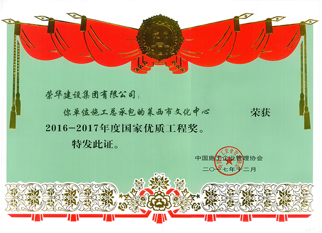 大會對獲得2016-2017年度國家優(yōu)質(zhì)工程獎、2016年度中國施工企業(yè)管理協(xié)會科學(xué)技術(shù)獎的獲獎企業(yè)和先進(jìn)個(gè)人進(jìn)行了表彰。由我集團(tuán)公司承建的萊西市文化中心工程榮獲“國家優(yōu)質(zhì)工程獎”。七公司總經(jīng)理吳克祥同志代表集團(tuán)公司參加會議并上臺領(lǐng)獎。