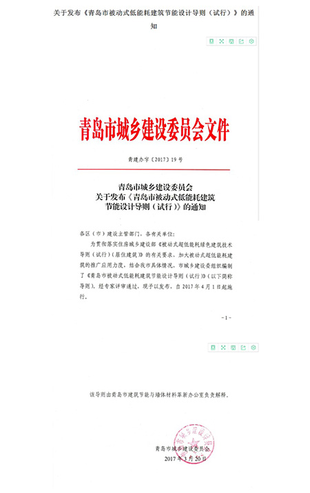 由我集團(tuán)公司參與編制的全國(guó)首個(gè)被動(dòng)房地方標(biāo)準(zhǔn)《青島市被動(dòng)房低能耗建筑節(jié)能設(shè)計(jì)導(dǎo)則》正式頒布實(shí)施。