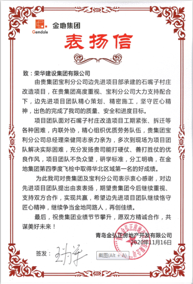 近日,集團(tuán)總部收到青島金弘正房地產(chǎn)開發(fā)有限公司發(fā)來的表揚信,對寶利公司邊先進(jìn)項目部承建的石嘴子村莊改造項目提出表揚。