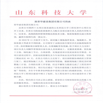 近日,集團(tuán)總部收到山東科技大學(xué)發(fā)來(lái)的表?yè)P(yáng)信,對(duì)三公司四十五(劉順華)項(xiàng)目部施工的山東科技大學(xué)工程實(shí)訓(xùn)中心項(xiàng)目提出表?yè)P(yáng)。