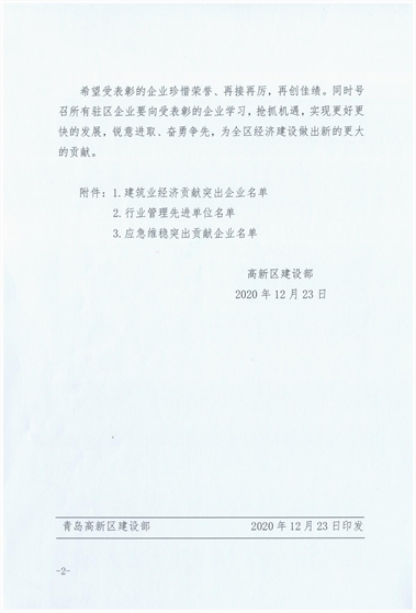近期,青島高新區(qū)建設(shè)部發(fā)布《關(guān)于關(guān)于表彰2020年度建筑業(yè)先進(jìn)企業(yè)的通報(bào)》,三公司第十六(王慎平)項(xiàng)目部施工的青島高新區(qū)碧桂園項(xiàng)目綜合管理水平優(yōu)異,為集團(tuán)公司贏得“行業(yè)管理先進(jìn)單位”稱號,并對集團(tuán)公司在重大活動(dòng)、應(yīng)急保障、清欠維穩(wěn)方面做出的突出貢獻(xiàn)進(jìn)行表彰。