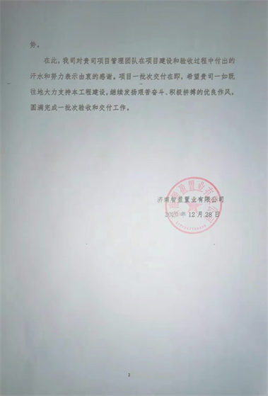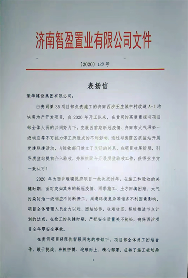 近日,集團(tuán)公司總部收到濟(jì)南智盈置業(yè)有限公司發(fā)來的表揚信,對一公司第三十五(仇留強(qiáng))項目部施工的濟(jì)南西沙王莊城中村改造A-1地塊房地產(chǎn)開發(fā)項目提出表揚。