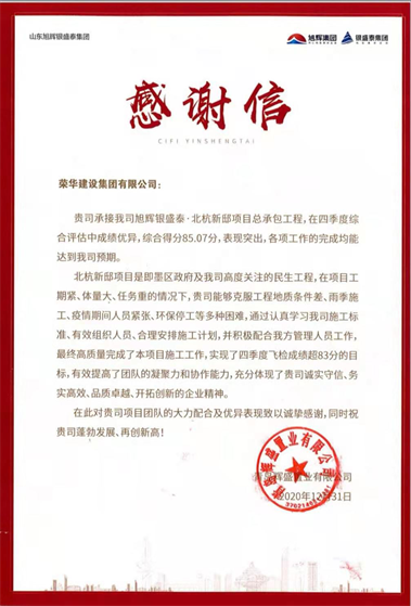 近日,集團(tuán)公司總部收到青島輝盛置業(yè)有限公司發(fā)來的表揚(yáng)信,對(duì)一公司第十一(孫慶現(xiàn))項(xiàng)目部施工的旭輝銀盛泰北杭新邸項(xiàng)目總承包工程提出表揚(yáng)。
