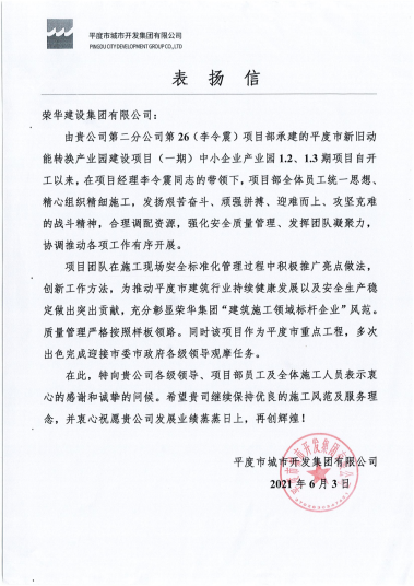 近期,集團(tuán)總部收到平度市城市開發(fā)集團(tuán)有限公司發(fā)來的表揚(yáng)信,對李令震項目部施工的平度市新舊動能轉(zhuǎn)換產(chǎn)業(yè)園建設(shè)項目(一期)中小企業(yè)產(chǎn)業(yè)園1.2、1.3期項目提出表揚(yáng)。