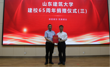 9月17日下午,山東建筑大學(xué)在博學(xué)會堂舉行建校65周年捐贈儀式。學(xué)校黨委副書記、校長于德湖,校黨委委員、副校長宋濤,集團(tuán)公司總裁趙成福、副總裁董建明及捐贈單位嘉賓出席儀式。山東建筑大學(xué)各單位、各部門負(fù)責(zé)人參加了捐贈儀式。捐贈儀式由校黨委委員、副校長宋濤主持。