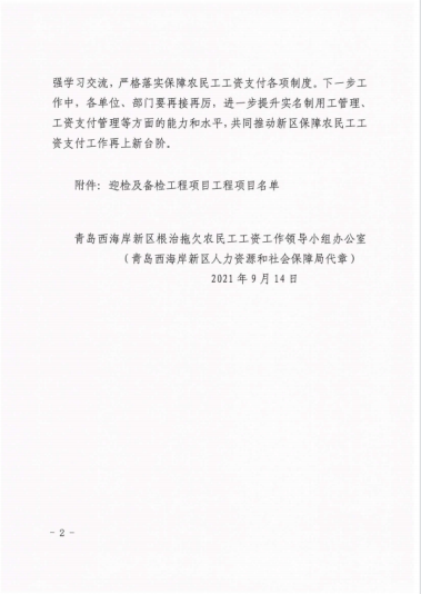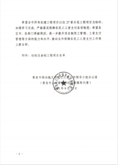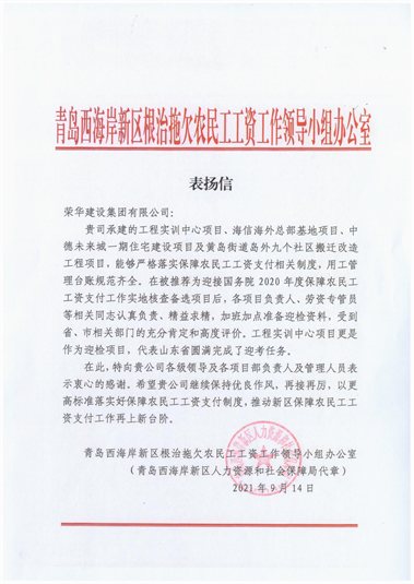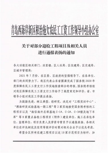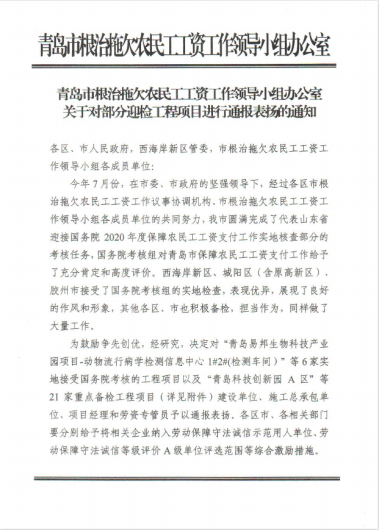 近期,集團(tuán)公司總部收到來(lái)自青島市、西海岸新區(qū)兩級(jí)根治拖欠農(nóng)民工工資工作領(lǐng)導(dǎo)小組辦公室發(fā)來(lái)的通報(bào)表?yè)P(yáng)。對(duì)集團(tuán)公司承建的山東科技大學(xué)工程實(shí)訓(xùn)中心項(xiàng)目、海信海外總部基地項(xiàng)目、中德未來(lái)城一期住宅建設(shè)項(xiàng)目、黃島街道島外九個(gè)社區(qū)搬遷改造工程、平度市新舊動(dòng)能轉(zhuǎn)換產(chǎn)業(yè)園建設(shè)項(xiàng)目(一期)中小企業(yè)產(chǎn)業(yè)園1.1-1.3期項(xiàng)目、海信.鳳臺(tái)世家、青島萊西市人才公寓建設(shè)項(xiàng)目、東城時(shí)代項(xiàng)目等8個(gè)工程提出表?yè)P(yáng)。