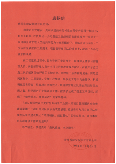 近日,集團(tuán)公司收到青島萬(wàn)城安投實(shí)業(yè)有限公司發(fā)來(lái)的表?yè)P(yáng)信,對(duì)一公司高洪龍項(xiàng)目部施工的中關(guān)村生命科學(xué)產(chǎn)業(yè)園一期項(xiàng)目提出表?yè)P(yáng)。
