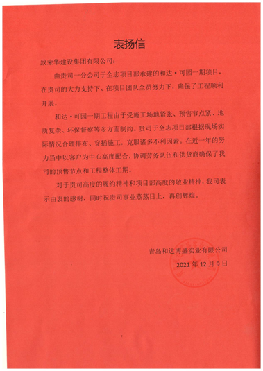 近日,集團(tuán)公司收到青島和達(dá)博盛實(shí)業(yè)有限公司發(fā)來(lái)的表?yè)P(yáng)信,對(duì)一公司第五十八項(xiàng)目部施工的和達(dá)·可園項(xiàng)目提出表?yè)P(yáng)。