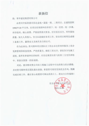 近日,集團(tuán)公司收到青島坤泰置業(yè)有限公司發(fā)來的表揚信,對開發(fā)區(qū)公司顏坤項目部施工的信達(dá)金地·藍(lán)庭一期、二期項目提出表揚。
