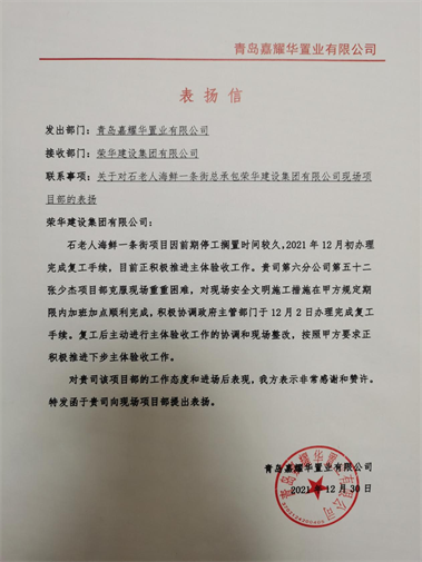 近日,集團(tuán)公司收到青島嘉耀華置業(yè)有限公司發(fā)來的表揚(yáng)信,對六公司張少杰項(xiàng)目部施工的石老人海鮮一條街項(xiàng)目工程提出表揚(yáng)。
