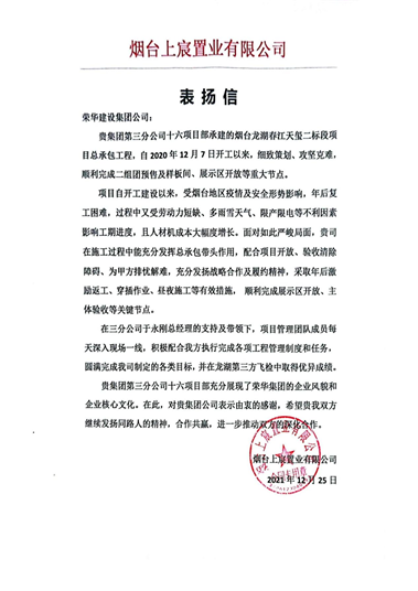 近日,集團公司收到煙臺上宸置業(yè)有限公司發(fā)來的表揚信,對三公司第十六(王慎平)項目部施工的龍湖春江天璽小區(qū)二標段項目提出表揚。