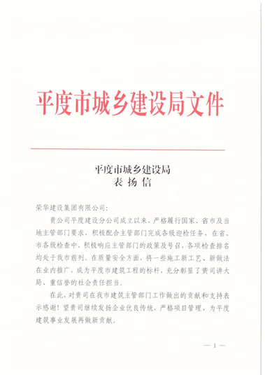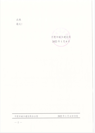 二公司受到平度市城鄉(xiāng)建設局表揚