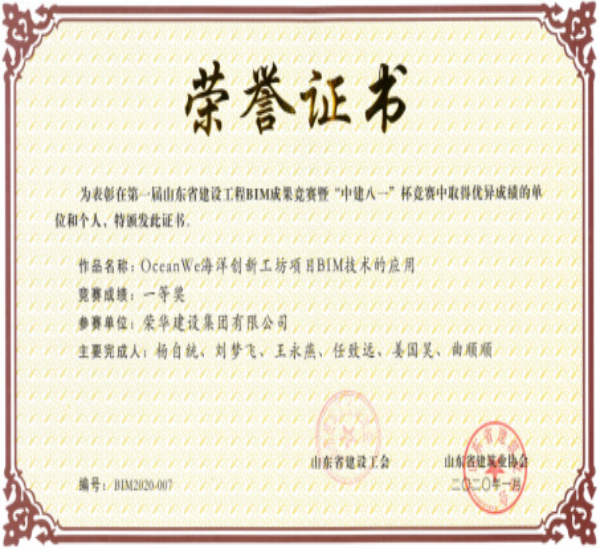 集團(tuán)公司《OceanWe海洋創(chuàng)新工坊項(xiàng)目BIM技術(shù)應(yīng)用》,榮獲山東省建設(shè)工會、山東省建筑業(yè)協(xié)會舉辦的第一屆山東省建設(shè)工程BIM成果競賽暨“中建八一”杯競賽一等獎。